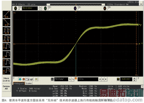 请看一下,显示波形是如何在触发点上被压缩成了一条非常细的线呢?这种现象正是我们在没有显示噪声或显示抖动的理想示波器上将会看到的(其中的具体原因,留给您下次在机场侯机等闲暇时间慢慢思考)。这并不是因为垂直噪声和水平抖动都消失了,而是因为它们恰巧在触发点处相互抵消。显然,传统的测量技术就逊色许多了。
