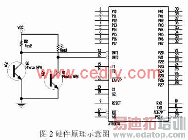 如下图2硬件原理示意图,光电对射管Q1和Q2分别接入AT89C51的外部中断0和1引脚相联,Q1和Q2均为遮断式对射管(无遮断时导通,遮断时截止)。INT0和INT1均设置为下降沿触发。在INT0中断处理程序中,启动AT89C51内计数器T0开始计数,在INT1中断处理程序中,计数器T0停止计数。计数值暂存于单片机寄存器内。当单片机接收到上位机发出的取数指令时,单片机通过串口将寄存器内计数值发送至上位机进行处理。