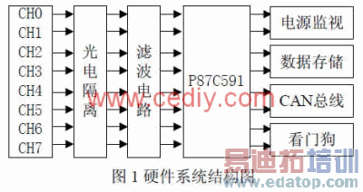 采集板的具体结构如图1所示。主要以单片机 P87C591为核心,设计对 8路电表进行数据采集,并可以将数据存入SEEROM中,另外带有掉电保护及通信接口等模块。
