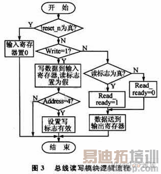 总线读写模块负责接收参数和指令,同时将处理后的数据输出到总线。接收总线数据子模块接收Avalon总线的数据并更新标志位;读信号触发向总线发送数据子模块进行数据传输。总线读写模块逻辑流程如图3所示。