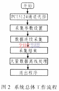 本系统基本工作过程是:肩动LabVIEW程序后,首先设置高速数据采集卡PCI-5124的通道、采样模式、采样频率、触发类型、触发电平等,然后启动采集,进行长时间连续的数据采集并利用流艋技术将采集到的信息实时存储于计算机硬盘,由于采集到的信息量很大,因此对采集到的数据进行离线处理,以减轻计算机CPU负担,提高数据处理速度。