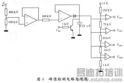 为了使FPGA能够准确地控制程控放大器的模拟开关,使程控放大器放大或衰减后的信号幅度在±1 V之内,又能够充分利用A/D转换器的量程。所以FPGA必须要先知道信号的峰值电压,这就需要采用峰值检测电路来检测信号的峰值电压。采样信号先经过电压跟随器来隔离输入信号和峰值检测电路,再用运算放大器、二极管和电容组成检测信号峰值。用三极管可以对电容上的电荷进行放电。最后经过比较器就可知道信号的峰值范围。FPGA通过定时检测峰值,从而去控制模拟开关,实时跟踪信号的幅度。峰值检测电路原理图如图4所示。