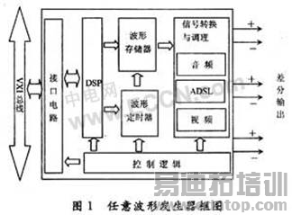 任意波形发生器如图l所示,可以以单端和差分模式工作,具有完整的波形发生能力,可以产生可修改的复杂波形,具有激励被测器件所需的定时功能。AWG作为VXI仪器系统的一个模块,通过标准化的接口模块与资源控制器通信,当需要产生激励波形时,资源控制器发送命令和参数到AWG模块,AWG模块采用高速DSP芯片作为主处理器,DSP与波形定时器和控制逻辑一起完成任意波形的产生,从而提供给被测器件(DUT)所需的激励波形。由于被测芯片种类繁多,频带范围很宽,对于不同的被测芯片,采用的定时器和控制逻辑都不尽相同,而且,随着电子技术的发展,频率合成技术已经广泛应用到测试测量领域,采用数字频率合成(DDS)专用芯片使得电路更加简洁可靠,因此,任意波形发生器的设计也更加容易,其抗干扰能力和精度都更加容易保证。