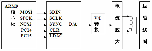 电磁流量仪表的励磁电路的任务是向励磁线圈提供一稳定的驱动电流。电流波形为方波、三值方波和梯形波等形式,波形变化的目的是结合信号处理电路,分析在不同励磁方式下电磁流量仪表的精确度、零点稳定性和抗干扰能力等多项指标。为研制高精度电磁流量计作探索性研究。该电路由核心板的SPI2 口输出数字量,经过 D/ A 转换形成模拟信号,经V/I转换激励和带有电流负反馈的电流放大器输出,适合各种励磁波形的变化。结构框图如图 4所示。D/ A 转换电路采用 AD7243 芯片,实现 12 位的 SPI同步串行输入 , - 5~ + 5 V 的双极性输出。与 ARM9 核心板的SPI2口对接,如图4所示。