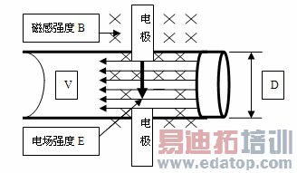 当流体在管道内流动经过一横向磁场B的时候,相当于有一定电导率的导体在切割磁力线,形成动生电动势和感生电流,通过管道径向两电极可以引出该电动势E,其大小与磁场B、流速V和管径D成正比,即: