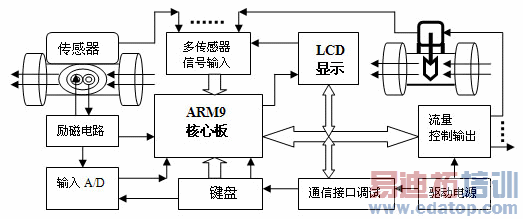 电磁流量仪表由测量装置和电路两部分组成 ,电路部分主要由检测输入模块、励磁输出模块、流量输出模块、图形显示模块、键盘模块、通信及调试接口、电源模块、以及最重要的基于 ARM9 嵌入式系统的核心板组成。图2 给出了嵌入式电磁流量仪表的系统框图。