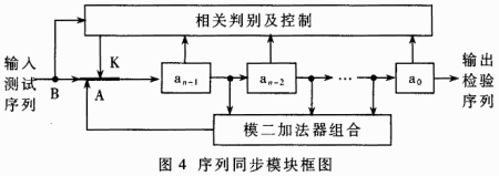 在初始状态下,开关K置于B位置,发端送来的测试序列在完成位同步后移位送入寄存器an-1…a0。存满后,开关K置于A位置。寄存器an-1…a0和模二加法器在本地时钟的驱动下产生出检验序列。由于m序列的下一存储器状态组合仅取决于当前的状态组合,因此,如果最初的9个接收码元是正确的,则随后产生的所有码元都是与测试序列相同和同步的。之后,测试序列与检验序列需要进行一次相关比较,如在若干个(如5个)码元周期内其相关值超过阈值,则可认为两序列同步,否则需要重新进行同步操作。