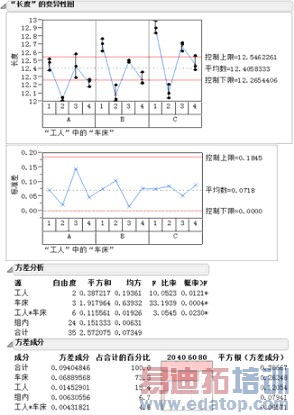 在JMP中实现变异源分析的功能,只要用到一个菜单命令,即“图形 >变异性/量具图”。选择“长度”为“Y,响应”,选择“工人、车床”为“X,分组”,在“结果”选项中,将“模型类型”由“稍后决定”改为“交叉”,点击“确定”后在新生成的报表窗口中选择下拉菜单命令“方差成分”,可以得到变异源分析的量化结果。