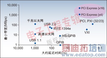 如果将测量总线比作高速公路的话,延迟时间则与公路上的红灯数量有关,而带宽则与公路的宽度和车辆行驶速度有关。延迟时间将对像数字万用表(DMM)测量、开关测量等应用产生直接的影响。而带宽在波形产生和采集以及射频测量等应用中非常重要。图1对不同总线的延迟时间和带宽作了比较。