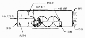 光电倍增管是一种真空器件。它由光电发射阴极(光阴极)和聚焦电极、电子倍增极及电子收集极(阳极)等组成。典型的光电倍增管按入射光接收方式可分为端窗式和侧窗式两种类型。图1所示为端窗型光电倍增管的剖面结构图。其主要工作过程如下:当光照射到光阴极时,光阴极向真空中激发出光电子。这些光电子按聚焦极电场进入倍增系统,并通过进一步的二次发射得到的倍增放大。然后把放大后的电子用阳极收集作为信号输出。因为采用了二次发射倍增系统,所以光电倍增管在探测紫外、可见和近红外区的辐射能量的光电探测器中,具有极高的灵敏度和极低的噪声。另外,光电倍增管还具有响应快速、成本低、阴极面积大等优点。