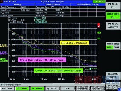 安装FSUP-B60选件后,信号源分析仪就配备了两路平衡接收通道。这种对称结构可以对两路通道进行互相关运算,通过这样的运算可以消除两路参考源的非相关固有噪声。混合的分量可以通过平均来消除,最终剩下的只有被测件的固有噪声,这使灵敏度不再局限于内部参考源的固有相位噪声。测量的改善程度主要决定于平均的次数,而最大可以改善达20dB。