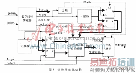 图5简单描述了计数器模块的基本构造。在计数器模块的设计中,使用了Spartan-3系列的数字时钟管理器,主要目的是将晶振时钟信号倍频后作为计数器的工作时钟,保证时钟周期小于延迟线的总延时。根据时序仿真所确定的延迟线单元的测量分辨率及长度参数,将晶振频率倍频为200 MHz。