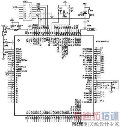 本系统主控电路如图2所示,主要由MSP430F449芯片、JTAG接口电路、时钟发生电路、时钟输出电路、复位电路、PWM波输出电路、供电电路等组成。其中JTAG用于下载和调试程序,PWM波输出电路用于控制气泵。当测量血压时,先充气至200mmHg高,再慢慢以每秒约下降5mmHg的速度放气。实现自动测量血压。