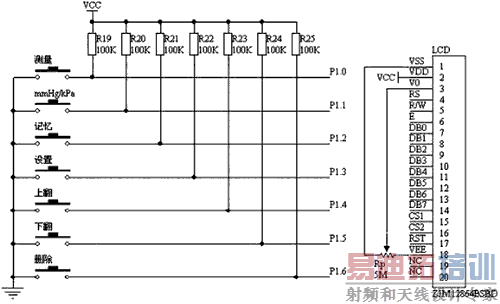 如图6所示,由键盘电路和液晶显示电路两部分组成。液晶显示电路采用ZJM12864BSBD,这是一款低功耗的点阵图形式LCD,显示格式为128点(列)×64点(行),具有多功能指令,很容易与MPU相连。其中键盘电路采用独立式按键,有7个按键,分别为测量、mmHg/kPa转换、记忆、设置、上翻、下翻、删除。可以进行日历时钟的设置,进行报警参数的设置,进行血压的测量值的存取和删除等功能。LCD可以显示收缩压,舒张压,当前的时间和日历;在查询状态时可以实现以往测量血压的日期、时间、测量值,同时可以通过软件编程实现历史数据的图形化显示(例如画出血压波动曲线),方便直观。