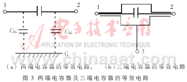 一般情况下,电阻、电感和电容等电子元件均被看作双端元件。两端电容器的等效电路示如图3(a)。由于各端钮对附近导电物体的分布电容C1G、C2G是变化的,