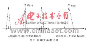 在这里,利用N位m序列产生周期为n=2N-1的伪随机序列" title="伪随机序列">伪随机序列 ,其自相关函数与平稳高斯随机分布的自相关函数之间的比较如图2所示。可见,m伪随机序列的随机性是具有周期性的,其周期为n,n即周期内随机变量的个数。实际上,伪随机序列就是随机序列的周期沿拓。图2中,τ为离散值。