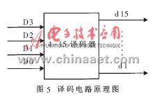 译码电路原理图如图5所示。四位二进制伪随机数码经4-15译码器译为d1~d15输出,高电平有效,d1~d15与伪随机数的对应关系如表1所示。当每一个询问触发信号到来时,m序列产生1个伪随机数,对应d1~d15中有一个为高电平。