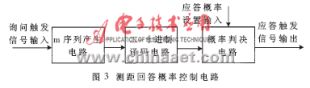 在测距回答概率控制工作过程中有几个特性需要特别注意。首先,测距回答概率控制电路由询问脉冲间接触发,即视频询问脉冲经处理后产生的触发信号为测距回答概率控制过程同步触发信号;其次,根据检测要求,测距回答概率范围应在0%~100%之间(一般达不到100%),并且以一定步进" title="步进">步进 可调,如10%或20%等;第三,两个测距回答概率控制电路输出的回答脉冲触发信号的间隔是随机变化的,而不是按相等时间间隔平均分配的;同时,测距回答概率控制电路的工作速度要快,以增强系统检测性能。