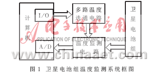 卫星电池组温度监测系统框图见图1。计算机通过数字I/O卡输出6位数字量到多路温度选通电路,选通单节电池的温度,经过温度监测电路处理后送A/D采集卡。