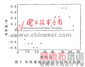 ,故可使用平行板电容器的计算公式来计算电容的变化量,从而为电路的线性度及分辨率实验提供理论依据。实验中使用变压器油(经测定相对介电常数为2.25)作为测试介质,并使极板间充以一半的变压器油。用滴定管以连续增加的油滴向容器内滴油。表1是测量电路输出值与变压器油变化量之间的关系。图4是输出值偏离理论直线图。由表1及图4可知,转换电路具有较好的线性度和分辨率。线性相关系数为0.999972,偏离理论值最大绝对值为0.27fF,分辨率为2.84fF。