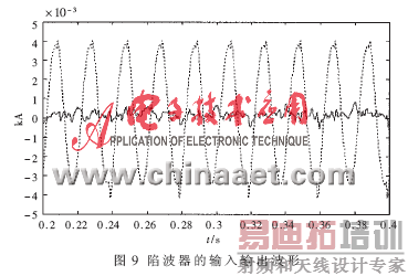 根据采用陷波器消除双向工频通信系统中谐波干扰的思想,首先选用合适的陷波器。由于电力系统中谐波干扰的频率基本是为基波、3次和5次谐波,是已知和确定的,兼顾陷波器设计的性能和成本的考虑,选取基于全通滤波器的IIR陷波器,将经带通滤波器预处理的数据输入陷波器中,输入和输出的波形如图9所示,谐波的干扰基本已经被消除。