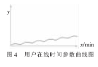 根据不同因素所起的作用,可以动态调节它们之间的权重值,游戏在相同的框架下也能体现出不同的游戏性。例如,动态修改x1与x2之间的权重,则捕鱼技巧和游戏难度之间的体验感就会发生变化。再者,可以在一些因素中加入动态参数,使因素权值发生游戏性的变化。例如,对用户在线时间参数x4引入相关计算公式y=[1+sin(x×π/t)]×x/30,y是因数权值,x是时间值,t是游戏送分减分周期,如图4所示,曲线的斜率和周期都可以作适当调节,使权重值随在线时间波动上升。