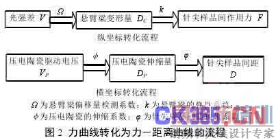 从测量原理来看,力曲线是 AFM 检测悬臂梁偏移量的光斑检测器的检测电压差和扫描器中的压电陶瓷管驱动电压的关系图。但是实际中经常应用的是表示检测悬臂梁的偏移量的光斑检测器的检测电压差和压电陶瓷的伸缩量关系的力位移曲线。当研究某些问题时,需要使用针尖样品间作用力和针尖样品间距关系的力-距离曲线图。因此若要完成力曲线与力-距离曲线间的转化,需要实现纵坐标参数从压差到针尖与样品间作用力的转化及横坐标参数从压电陶瓷驱动电压到针尖与样品间距的转化。转化过程如图 2 所示。