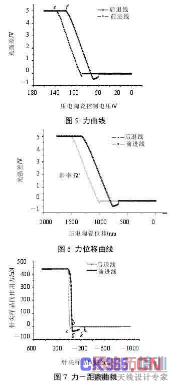由于压电陶瓷的反转滞后很大,使前进线的末点 e 与后退线上始点 f 发生了偏移,使在曲线上对同一点的分析带来不便。因此,曲线转化过程中,需要消除仪器本身带来的滞后。为了精确计算灵敏度" ,需要取多点,利用最小二乘线性拟合方法来确定。由于接触区并非绝对的线性,在近似线性区域内选取数据点,减少误差。