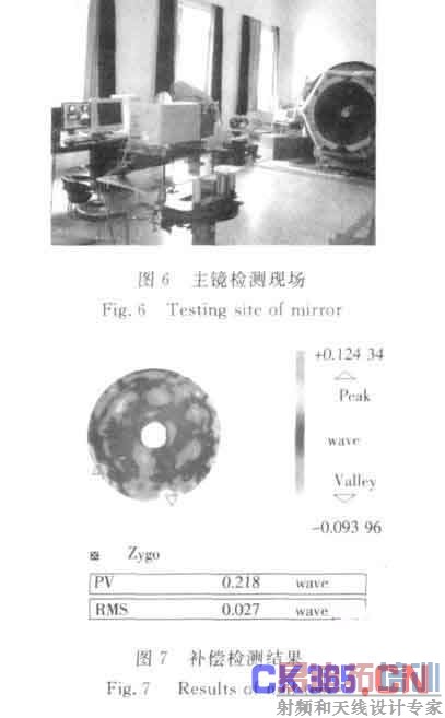 该补偿器已用于主镜抛光过程中检验。抛光初期主要用三坐标测量机检验,这一方面可以控制较大的面形误差,另一方面也可将主镜顶点半径控制在许可误差范围内。图6为主镜检测现场,图7为最终补偿检测结果,面形误差为0.027λ(RMS),根据相应的ZERNIKE拟合系数中的球差分量Z8=0.014λ,则抛物面主镜的二次曲面常数K的误差为0.030 6%,与<0.048 5%(包括主镜半径误差)的预测符合,这进一步证明了补偿器的设计和误差分析是合理、可靠的。