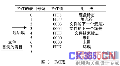 FAT是给每个文件分配磁盘物理空间的表格。FAT16簇数的上限是2 16,即65536个,每簇扇区数的上限是64个,因此其分区空间的上限为2G。FAT1位于逻辑1扇区。FAT簇映射中,0000表示空簇,FFF0~FFF6备用,FFF8~FFFF表示簇链结束,FFF7表示坏簇,其余值表示其后续簇的簇号。图3所示的文件起始簇号为2,结束簇号为4,共占用2、3、4三个簇。