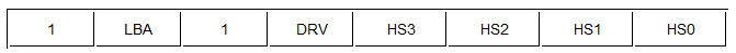 LBA 1为LBA方式,0为C/H/S(柱面/磁头/扇区)方式;DRV 选择驱动器0或驱动器1;HS3~HS0 LBA27~24,或为C/H/S方式的磁头号。