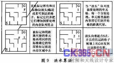 洪水算法即使用256 B额外内存,会大幅提高性能。该算法比一般迷宫算法的有效率高20~50倍。同时可以在内存中建立一个区域,与实际中的迷宫格数一一对应。在实际使用时算法并不太复杂。该额外内存区域称为“浪头”,它将体现在内存区域的实际状况中如图9所示。当迷宫被淹没的时候,一个波浪的前头从目标格向外扩展。在内存区域中这种单元格是惟一需要处理的,当浪头到达开始的单元格子,机器人已经被淹没。通常来说,开始的单元格可以是任何一个格子。但是为了方便起见,把开始点设在迷宫的第一个单元格,终点任意。反过来也可以把出口放在第一个单元格,把开始点设在中间或希望的位置。一旦到达了起点即搜索完成,最短的路径可以使机器老鼠移动到周围的格子中数值比较小的那个格子去,依次类推机器老鼠就能走到终点。