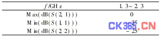 从以上仿真结果分析得知, 宽带功率晶体管放大器输出电路阻抗匹配较好, 在频率范围为: 1. 3 GH z~2. 3 GH z范围内, S21正向传输系数接近0 dB, S11、S22即两端口反射系数均小于- 25 dB, 匹配网路两端口驻波比均小于1. 2, 说明正向传输很大, 反射很小。