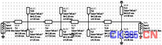 将上面得到的匹配电路用ADS进行仿真, 把各节微带线的长度和宽度设为变量, 并对其进行优化(如图3所示) , 步骤如下: