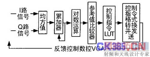 数控AGC 原理框图如图1 所示,在信号数字化后,根据样本估计出信号功率,与参考值比较后,反馈控制前端的数控VGA 芯片,将信号输出调整到ADC 的满量程附近,以获得全程数字量化和最大输出信噪比。