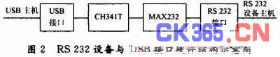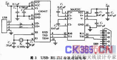 根据原理框图,选择恰当的协议转换模块是设计该卡的关键。设计转换卡的方法有好几种:一种方法是采用通用的USB控制器,利用其内置的通用异步收发器(UART)在USB与RS 232之间进行信号转换,例如EZ-USB,PIC16C745,CY7C63001等,若没有内置UART,也可以利用通用I/O接口模拟RS 232的收发过程;另外还可以采用单独的USB接口收发器芯片,如ISP1581,PDI-USBD11/12等,但这种方法需要另配微控制器才能工作;第三种就是采用专用的USB与RS 232转换芯片,如CH341芯片,这种芯片的优点是数据接收和发送的协议转换工作全部由芯片独立完成,无需干预,也不用编写芯片的固件。本文采用CH341的简装版CH341T来设计USB-RS 232转换卡。图2是一个利用CH341T和MAX232进行USB接口设计的硬件框图。如图所示,该硬件系统由4部分组成:USB接口、CH341T、MAX232和RS 232接口。其中,USB接口用于连接USB主机,在此选用USB总线接口的A型连接头;CH341T用于完成USB接口转RS 232接口的所有硬件功能;MAX232用于完成RS 232与TLL/CMOS的电平转换;RS 232接口用于连接RS 232设备。根据实际需要,选择目前广泛应用的DB9连接器。