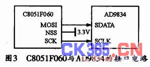 本设计采用单片机C8051F060并通过SPI接口向AD9834发送命令和数据,再由AD9834产生系统需要的扫频信号。C8051F060的SPI是一个高速同步串行输入/输出口,可支持主/从形式的多机通信,通常用于DSP控制器和外设或另一个处理器之间以串行方式进行通信和数据交换。通信时一般使用四条线,即串行时钟线SPICLK、主机输入/从机输出线SPIMISO、主机输出/从机输入线SPIMOSI、从传送使能线SPISTE。而AD9834有三根串行接口线,且与SPI等接口标准兼容。由于单片机只向AD9834发送数据。而不需要接收数据,因此,设计时可将单片机的SPI设置为主器件,NSS置为高电平。C8051F060与AD9834的具体接口电路如图3所示。
