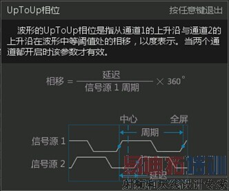 按下【Measure】键,打开测量项选择菜单,转动旋钮B选中时间范畴内的相位参数项,相位测量分为上升沿到上升沿的相位差、下降沿到下降沿的相位差,可通过长按旋钮B查看参数项的解释信息,其中有文字描述、公式显示和图解说明,图文并茂,简单易懂!返回到主界面,由于全硬件测量机制,测量结果即刻显示。