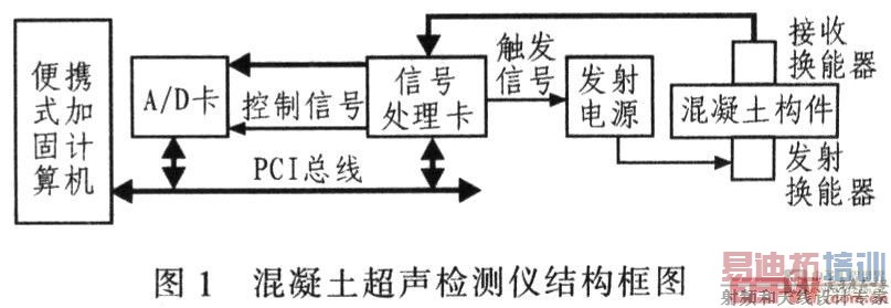 该检测仪可实现24通道高速并行数据采集,可将接收换能器传来的模拟信号进行放大/衰减,A/D转换,数字信号处理和分析等,还可向发射换能器输出激发脉冲。其工作过程为:计算机通过PCI总线向信号处理卡和A/D卡发出各种配置命令;当软件执行命令时,计算机向信号处理卡的触发寄存器写入开始采集命令,信号处理卡接收到命令后分别向发射电源和A/D卡发出特定宽度、特定延迟的触发控制信号,发射电源被触发脉冲触发后开始向发射换能器高压放电,发射换能器受到激发后向被测混凝土构件发射超声波;接收换能器接收到超声信号并将其转换为电信号,电信号经处理后送到A/D卡;A/D卡在接收到信号处理卡的控制信号后开始A/D转换,同时将转换后的数字信号通过PCI总线传送到计算机内存,然后进行数据处理。