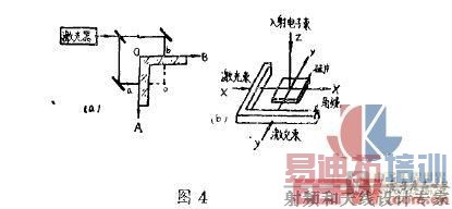 3.激光测量座标系中要求x、y方向的激光束(图4a中的a线和b线),垂直入射到L形长条反射镜x、y方向的两个镜面上(图4a的OA而和OB面),避免余弦误差,因此要求干涉仪在装调过程中合理地选用基准面,保证测量光束与反射镜面的垂直度误差△。在1角分内。