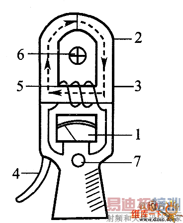 图1 交流钳形电流表结构示意图(1-电流表;2-电流互感器;3-铁芯;4-手柄, 5-二次绕组;6-被测导线;7-量程开关)