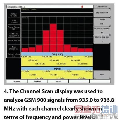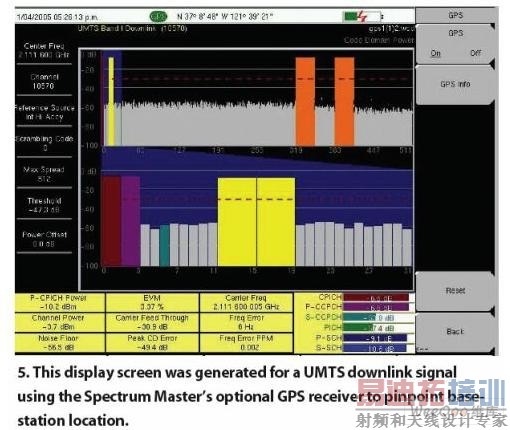 这些新款Spectrum Master分析仪都配有各种可选功能,如支持标量网络分析仪(SNA)型扫描频率测量的波形发生器。可选的波形发生器可以产生步长为0.1dB功率范围为-40~0dBm的450kHz~7.1GHz的校准信号。另外,采用PSN50型号的功率计传感器,通过USB与分析仪相连,还可以增加精确的功率测量能力;信道扫描功能可以简化无线标准信道的分析,如GSM和UMTS系统;内置的全球定位系统(GPS)接收器可以提供精确的位置指示;WCDMA/HSDPA RF测量功能则可以检测和显示高级无线通信信号。例如,信道扫描显示用于分析935.0~936.8MHz的GSM 900信号,可根据频率和功率电平清晰地显示每个信道(图4)。GSP可选功能可以在分析UMTS波段1下游链路时打开,从而为被测信号提供位置代码(图5)。