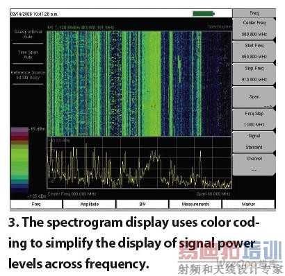 每个Spectrum Master分析仪都提供通用显示功能,从而更好地理解和分析捕捉的数据。例如,频谱显示用来检查频率为850~910MHz、具有彩色功率电平的蜂窝范围,以帮助简化分析(图3)。