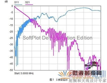 下图7所示为一个二端口S参数中的S11和S21的基本图示,蓝色的表示S11参数又称为回波损耗,粉红色的表示S21系数又称为插入损 耗,S11表示信号经过通道后的反射情况,S21表示信号经过通道后的损耗情况。从图中可见,随着频率的升高(S参数曲线的横轴表示频率,纵轴表示幅 度),反射越来越强(S11曲线越接近0dB),损耗越大(S21曲线下降的越大)。反射越强表明系统的匹配可能没有做好,通道损耗过大表明走线可能太长 了,曲线不平滑则表明通道的阻抗连续性不是很好等。