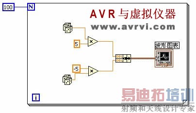 - 切换到程序框图,放置一个For循环,计数端子取值为100,这样每次运行产生100个数据。在循环体内放置两个随机数产生函数,分别乘上一个因子5和-5。如图:
