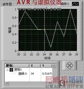 波形图和波形图表得大部分组建及其功能都是类似的,特别的是波形图具有光标指示器,利用它可以准确地读出波形曲线上的任何一点数据,便于分析某一时刻的特性值。如图: