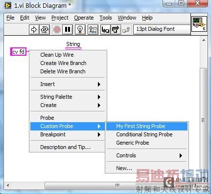 新建一个VI,并加入一个String控件,此时在右键快捷菜单中选择Custom Probe>> My First String Probe菜单项,如图 15所示。