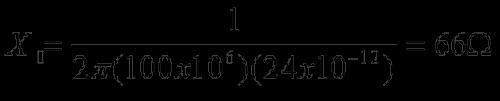 在这里,容性阻抗Xc(单位Ohm)同频率f(单位Hertz) 和电容C(单位Farads)的积成反比。利用之前的例子做一个简单计算可知,当频率为100KMHz时候,24pf电容