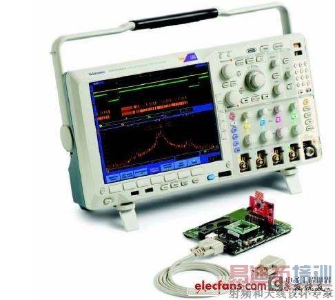 为调试这个器件,我们使用泰克MDO4000系列混合域示波器。MDO4000 系列拥有独特的功能,可以同时显示4 个模拟信号、16 个数字波形、最多4 条解码的串行总线和/ 或并行总线及1 个RF 信号。所有这些信号都时间相关,显示控制信号对模拟域和RF 域的影响。图2 说明了下述测试使用的设置。