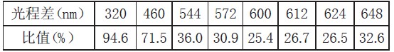 由图1 可总结出,在有效光程差较小时,可见光的各波长比较聚集,颜色只有黑白两色。在有效光程差300nm 附近出现一亮态极大值,之后随着有效光程差的增大,不同波长的相位差差别越大,其亮态峰值将越来越小。